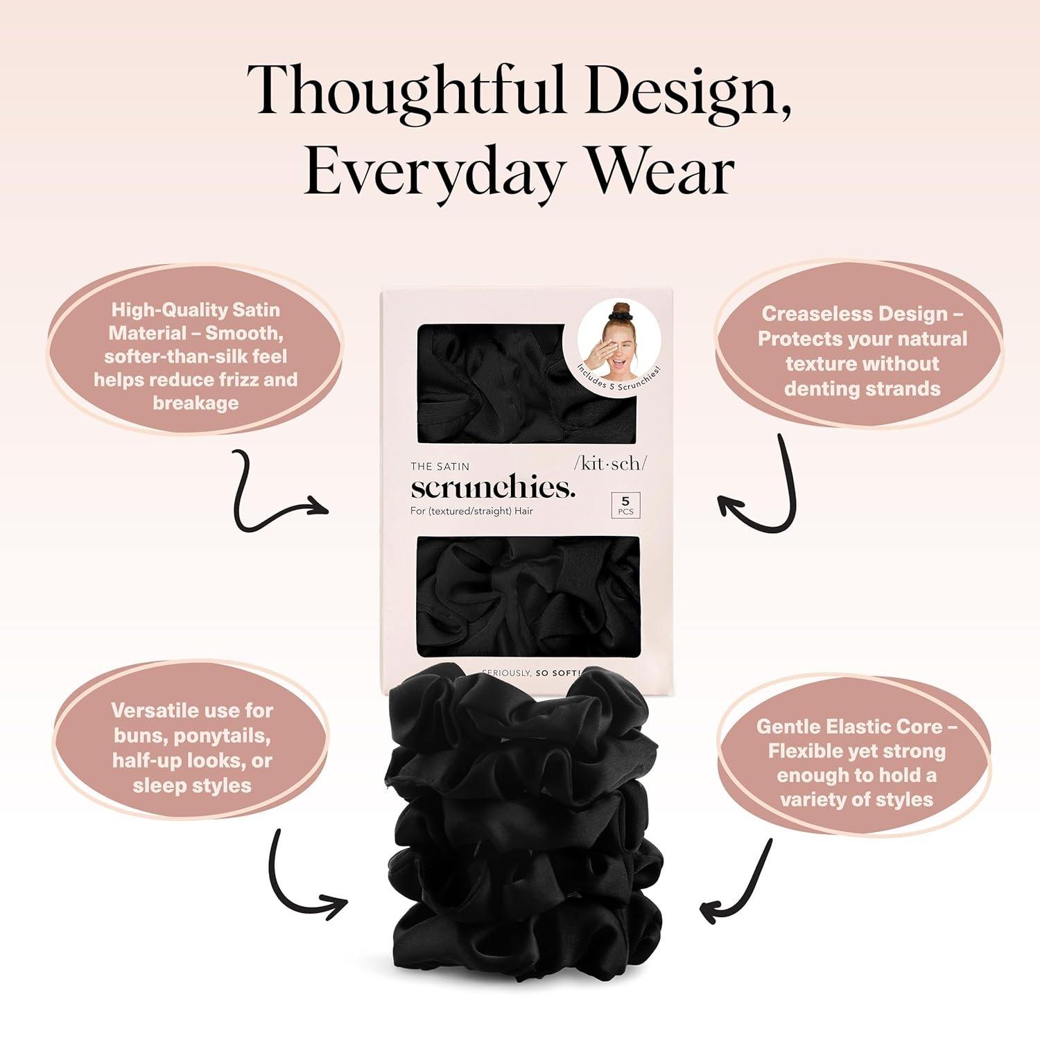 NOT YOUR USUAL SCRUNCHIES – FRIZZ-FREE SATIN SCRUNCHIES FOR WOMEN: Wake up to smoother, frizz-free hair with Kitsch satin scrunchies for women. Designed for gentle overnight wear, these hair ties glide effortlessly to prevent creases and breakage.