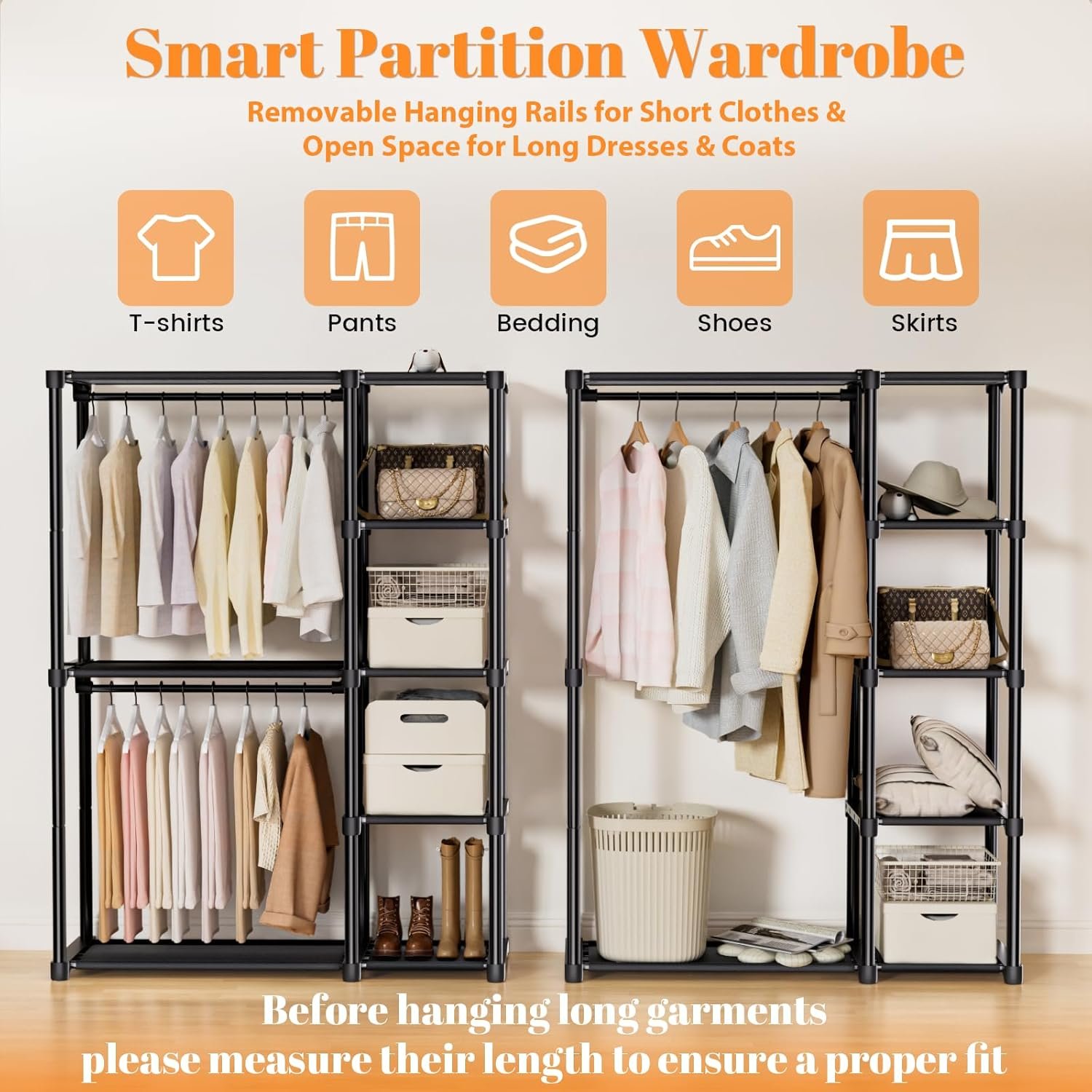 ✨ Massive & Versatile Storage Space Say goodbye to clutter! This clothing rack with shelves features a spacious hanging rod for longer garments like dresses and coats, plus 4 wide shelves to neatly fold and store sweaters, jeans, shoes, handbags, or bins of accessories. Everything has its place, making organization a breeze.